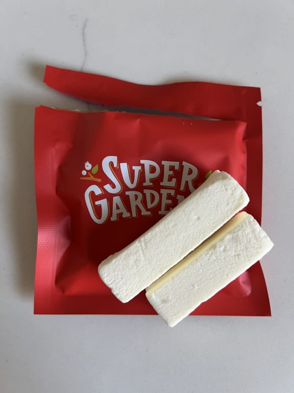 Vanilla bubble gum ice cream with marshmallows, freeze-dried