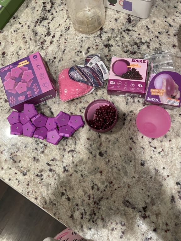 My daughter bought me this set for Christmas and I absolutely love it. I don't have small children so nothing to worry about there, just two Siberian Huskies so I make sure not to play with the magnets near them in case one were to fall which it has. My squishy ball got sticky and looked it up here I have to put some corn starch yahhh. I have noticed my anxiety is less when I use any of the items in the pic.