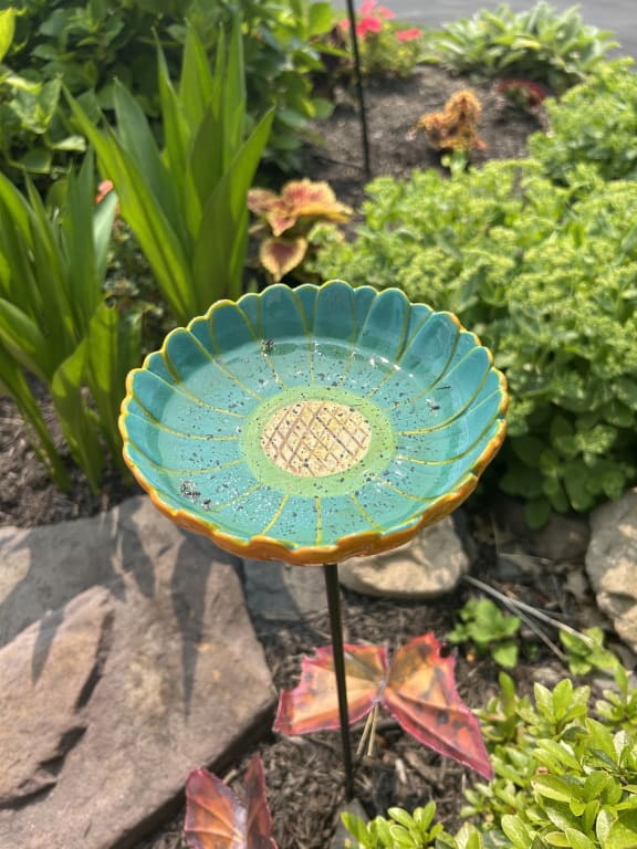 Attract and enjoy backyard wildlife with this ceramic bloom that holds food or water.