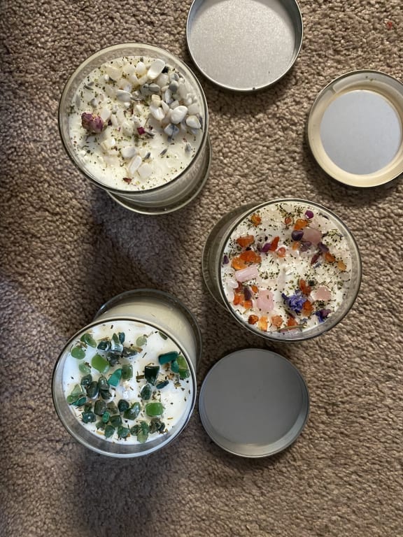 crystal, soy wax, natural oils, cotton wick, glass jar