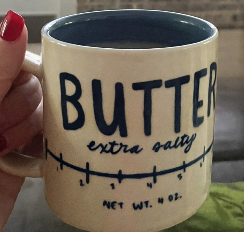 I recently gifted the "Butter-Extra Salty" mug to a friend. She absolutely loves it. I receive pictures of her enjoying it often. I was so glad to find this mug on Uncommon Goods as I have bought mugs by this artist in the past. All are very well-made with attention to details and being able to put the Mug in the dishwasher is a plus!!