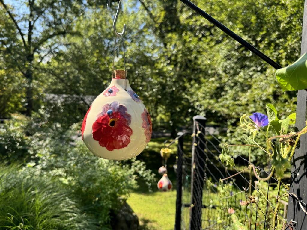 This hand-thrown, hand-painted ceramic feeder with a raised floral design attracts thirsty feathered friends to your yard.