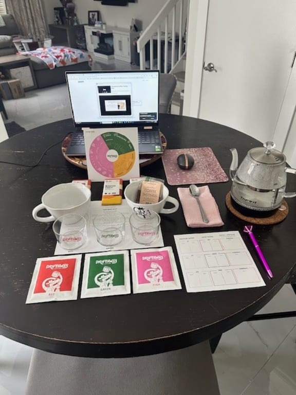 Our at home coffee and chocolate tasting experience was a great way to experience it. We received the tasting kit with plenty of time to set everything up, and the instructions were easy to follow. When our Zoom session happened Shanda and Julien did an excellent job of leading the experience. The coffee and chocolate we received was also of great quality. The only small negative was that the chocolate had melted in transit, but had solidified by the time of our tasting. Overall, I would recommend this to other people, and I'll probably be purchasing some of this coffee.