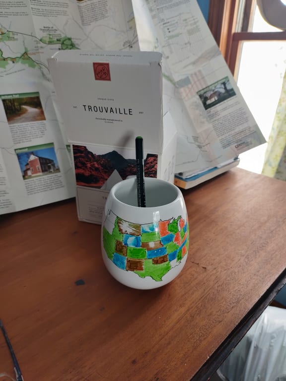 I enjoy maps and traveling and remembering those travels, this mug marries them together. I HIGHLY recommend getting the expansion pack of markers because one color doesn't really cut it once you start coloring in neighboring states and just any old marker won't work.