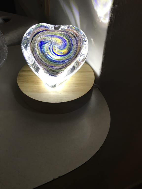 My stepson had to travel to TX for an extremely stressful situation. He took my gift to him, the heart containing his Fathers ashes, with him needing the calmness and sensitivity of his Father to bring him through the event. It touched my heart to know this gift meant so much to him.