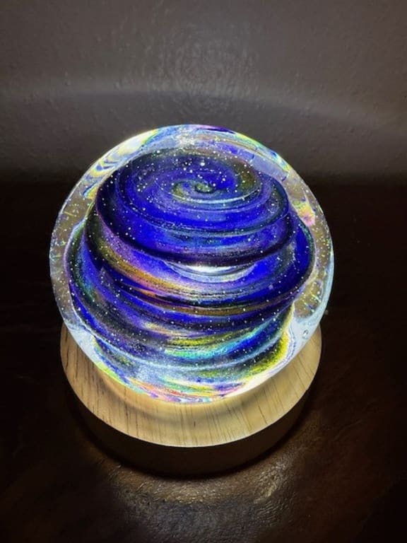 I love this Cremation Memorial Orb Sculpture so, so much! I lost my father unexpectedly and this lets me keep a part of him nearby. It is not only beautiful to look at, the sentimental value is priceless. The creator asks for memories and the likes of the person you lost and said it helps him when he creates the piece. I love that thoughts of my dad and his likes and his personality were going through the creator's mind while he made this beautiful treasure. I absolutely, completely recommend this piece. I could not be happier with the results.