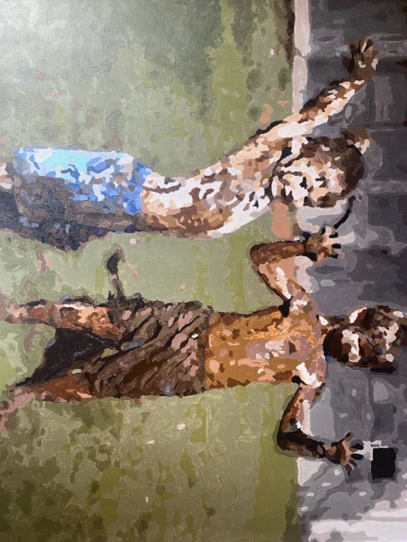 acrylic paint, biodegradable polystyrene, cotton canvas/poly blend, paint brushes