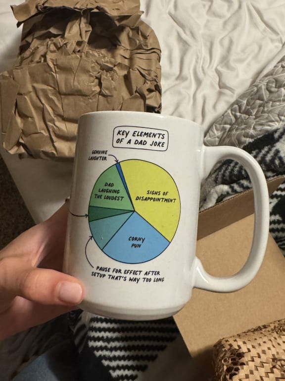My son spotted this mug and it was so perfect I went out a returned another mug I had already purchased for Father's Day. My husband absolutely loves it and thoroughly enjoys torturing all of us with his daily dad joke!