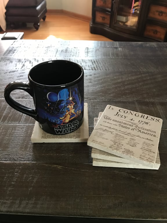 I actually feel like I become George Washington crossing the Delaware when I use these coasters and glasses together. I bought them along with the constitution whiskey glasses for my dad, and he loves them. He always uses them together, and they look awesome. They are also used with coffee mugs every morning, and often wine as well. As a family of whiskey drinkers and American history lovers, everyone who comes over thinks they are dope. They look great on display - my dad keeps them out on the coffee table all the time. The marble is great quality, the cork pads on the bottom protect the table, and glass sweat does not mess up the condition of the type. Very aesthetically pleasing. These coasters have inspired me to repurchase the Louisiana Territory for even less than 4 cents an acre. GIVE ME LIBERTY OR GIVE ME DEATH. And buy someone these coasters.🇺🇸