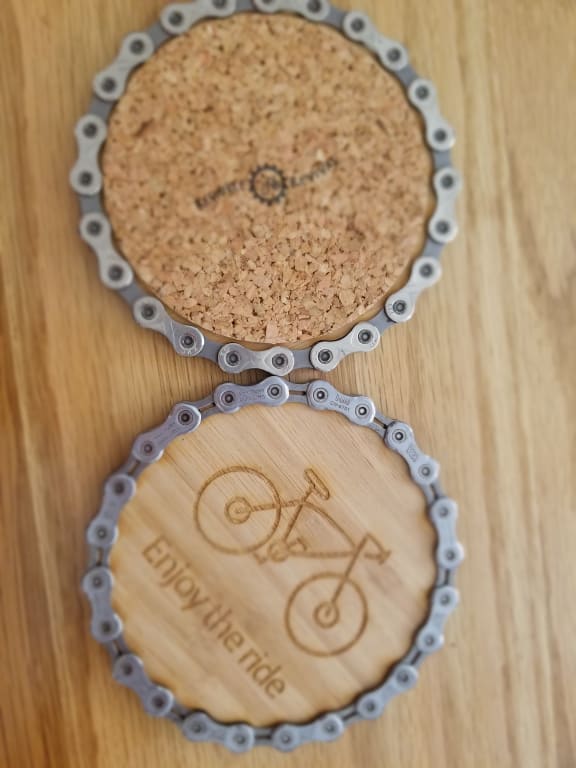 Nowdays the recycling is "the thing" and this is just a perfect example of using parts that we never thought we could put them into something creative. Anybody needs a coasters and those are recycled with durable edges, promote outdoor life and recycling and start a conversation of all of the above. Each coasters has a different bike. Great topic conversation with kids!