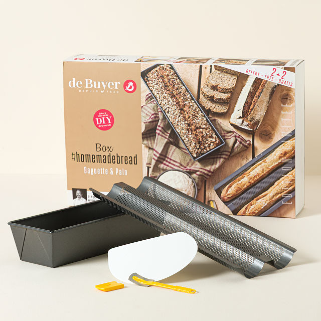 - Includes perforated nonstick baking tray for two baguettes, rectangular mold for loaves, baker blade for scoring loaves, dough scraper, and exclusive recipe.