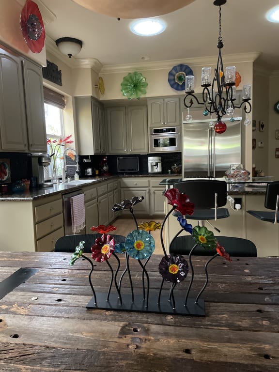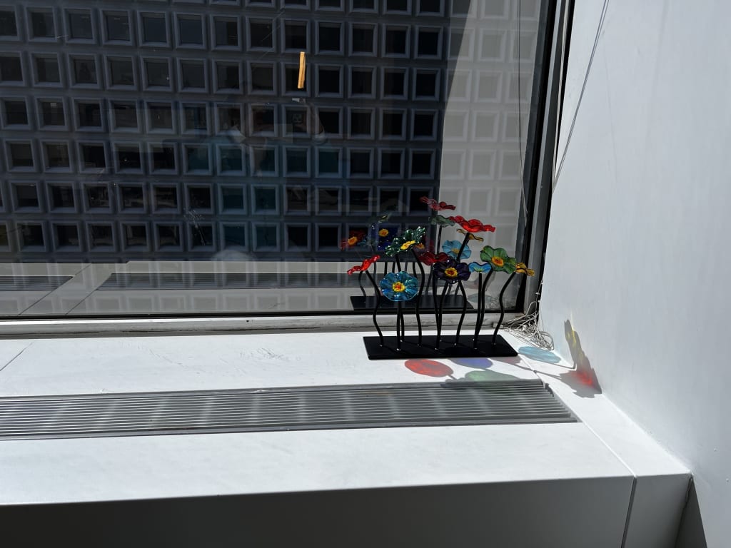 I have this beautiful glass centerpiece by a window in my kitchen. The window faces another building. Instead of looking at bricks, I now enjoy well crafted, colorful glass flowers brightening up my space. It's a pleasure walking into the room!