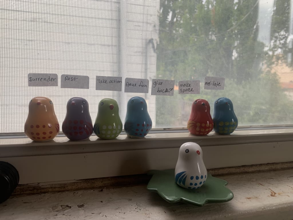 I have created 7 general advice categories for the birds, as a way to help guide my day. Like: Rest, Take action, surrender, give back etc. Each day I look at the assortment of birds and based on intuition I choose a color. I then put all birdies into a hat and take them out random to place next to one of the seven Daily Directives. Wherever my color lands for the day, that's what I do!