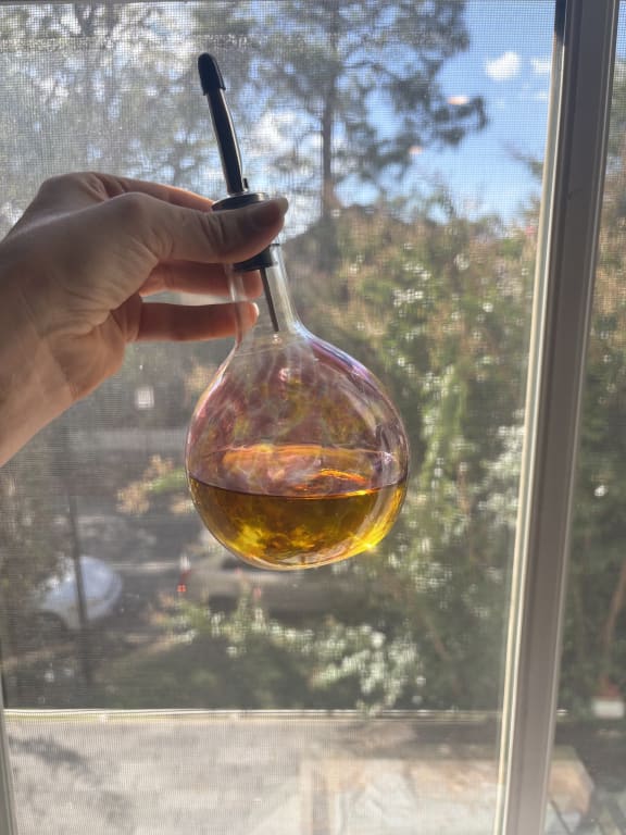 This oil pourer is beautifully made and makes an excellent addition to display on my counter. The colors are pretty and it goes well with my decor. I bought another as a gift!