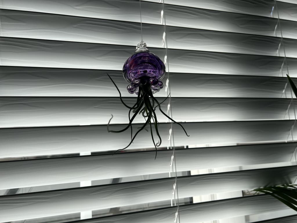 Soak plant in room temperature water for 20 to 30 minutes, gently shake and air dry (and possibly name) your plant before placing in your Jellyfish. If you live in an arid, hotter climate frequent watering or misting will be needed. Bright indirect light or a grow light is recommended. Air plants do best in 50 to 90 degrees. Jellyfish & air plants should be brought inside before temperatures drop below 40 F.