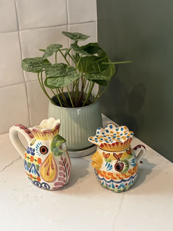Majolica Rooster Creamer & Sugar Jar