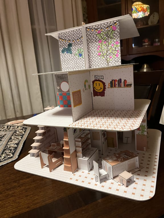 225+ pre-cut patterned cardboard pieces to assemble a two-story house, furniture, and accessories