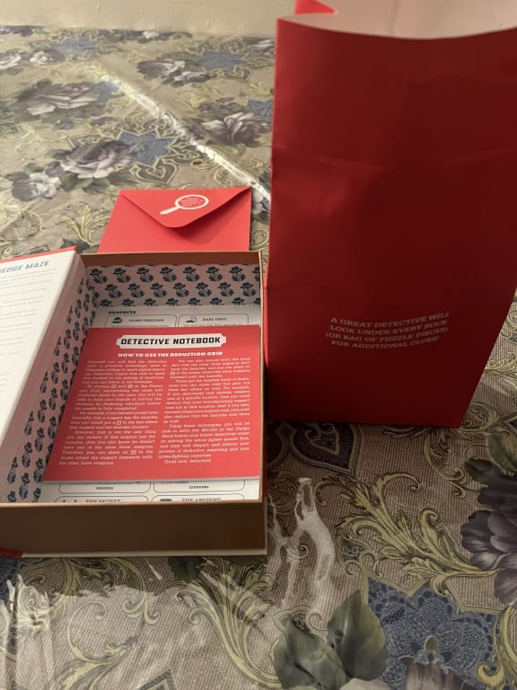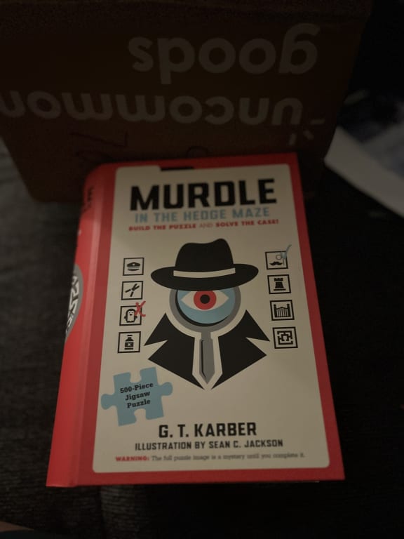 I love puzzles and enjoy putting them together! When I came upon this "Murdle in the hedge maze" puzzle I got intrigued and had to get it! The puzzle comes in a cute box and inside the box you can read the story introduction as well as a well written instruction on how to go about solving the murder! If you get stuck then there's an envelope that says "clue" and has the picture of the puzzle!