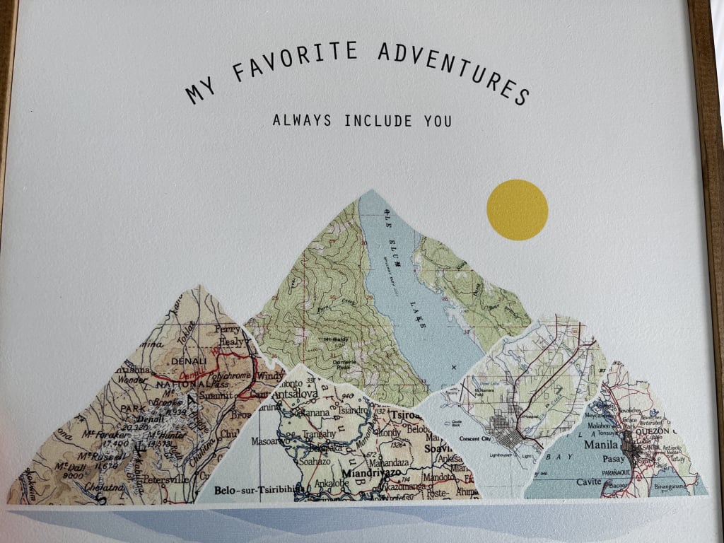 My Wife and I love going on travel adventures. Neither of us thought we'd ever be able to go to some of the places we've been. To commemorate some of our trips, I commissioned this with 11 places we've been, with a touching sentiment about her being my favorite adventure. It was a total, unique surprise. She was moved to tears and cherishes it so much. We're working on our next one with new adventures!