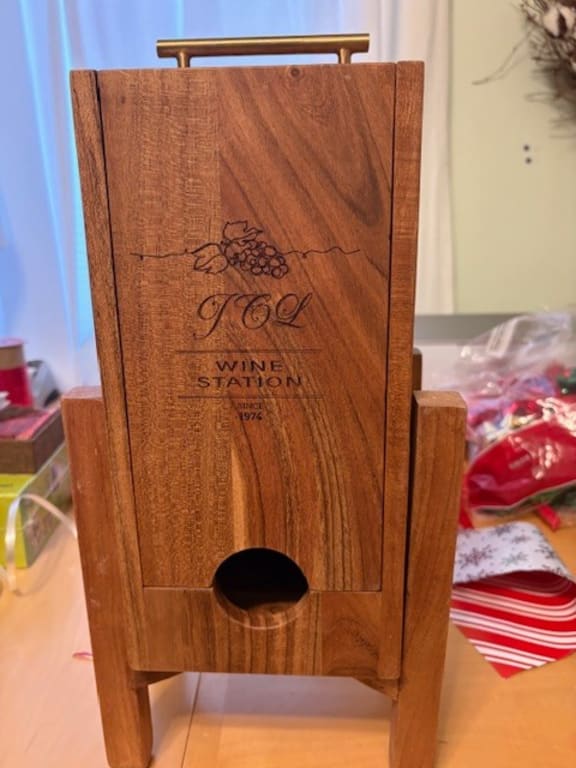 This was a gift to my husband, a box wine aficionado. It looks very nice and atyrdy. The base was aligned and did not wobble. The metal handle is a good touch, however, it is quite difficult to get the box inside. The lip on the top part prevents the box from fitting inside.We tried to cut the top of the box wine, it slipped inside but then the sliding part of the dispenser wouldn't fit. So we took the wine out of the box and it worked OK. I am guessing this was made with certain wine box measurements and wouldn't fit every wine box? Not sure if we were supposed to take the wine out of the box. Either way, it's a well made piece and looks nice sitting on a counter.