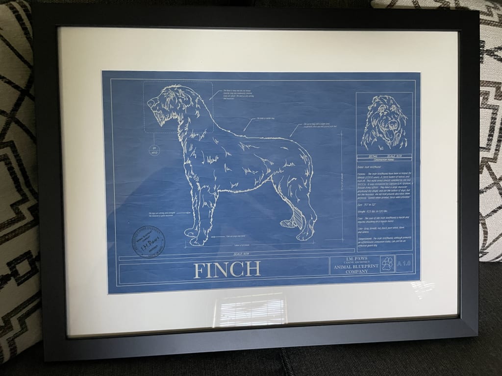 Wonderfully framed, and the blueprint does, indeed, look like a blueprint. The details about the breed that are interspersed throughout the picture itself have a touch of humor in their descriptions, and the ones for a Golden Retriever do indeed ring true. This is a unique gift to give to someone(s) both difficult to shop for (in the sense that they don't "want" or need anything), as well as for any individual who has deep attachment to their canine, furry family member