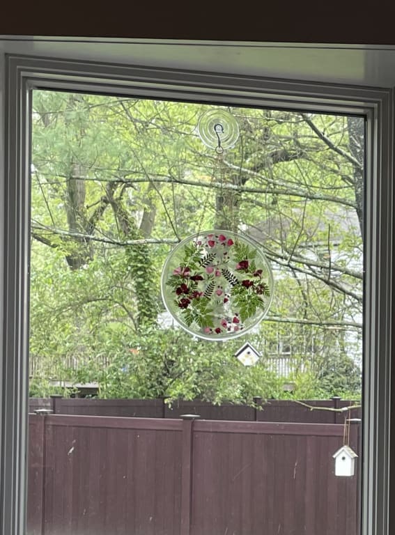 This piece is absolutely stunning. The flowers are great quality, have great vibrancy, and they are arranged so nicely. The piece is easy to hang and has a strong hold. It looks lovely in a window or against a wall.