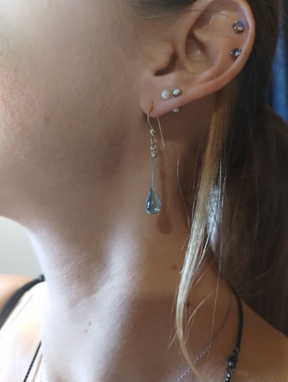 Super easy care! Just polish them with a soft cloth to keep both the glass droplets and recycled silver looking their best. The quality materials mean they'll stay beautiful with minimal effort.