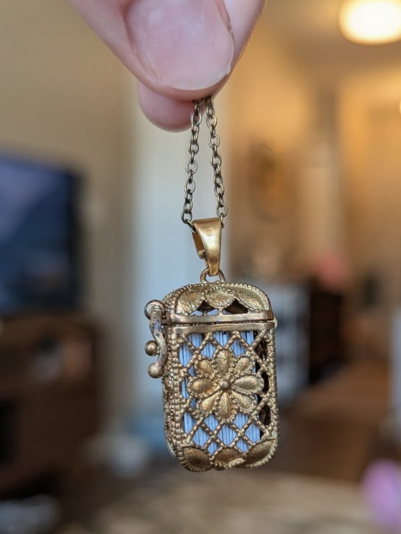 I love everything about this little pendant necklace. It's just the right length, I love the darkened or antiqued chain. The vessel that holds all the little cards is pretty filigree.